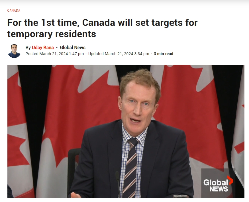今日,加拿大移民部长马克·米勒宣布,加拿大政府将首次设定临时居民人数上限。