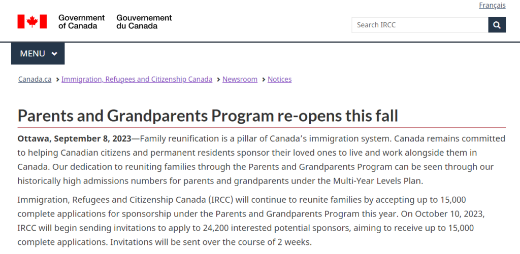 当地时间9月8日,加拿大移民局宣布启动2023年父母和祖父母团聚移民项目。