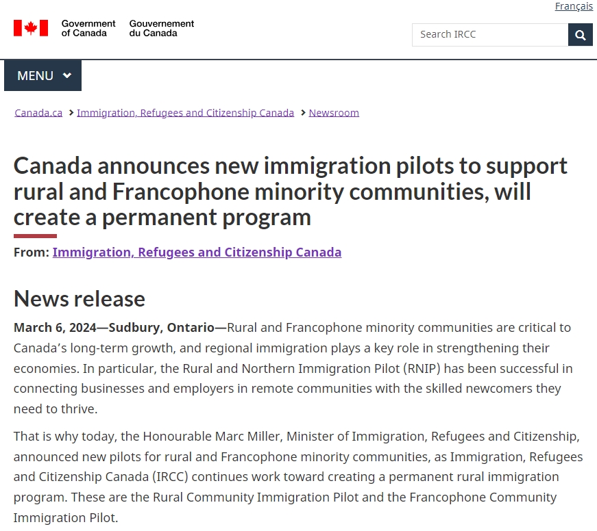 当地时间3月7日,加拿大移民、难民和公民事务部(IRCC)部长马克·米勒宣布将针对农村社区和法语少数民族社区推出新的试点项目,这两个项目分别为村社区移民试点项目法语社区移民试点项目