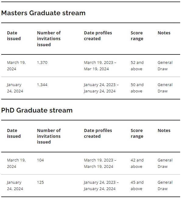 近期安省硕士毕业生类别和博士毕业生类别邀请情况: