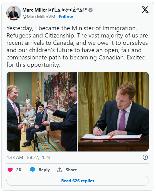 Miller自2021年10月起担任加拿大政府与土著关系部(Crown-Indigenous Relations)部长,在不到两年时间后,接过果了移民部长的重任。