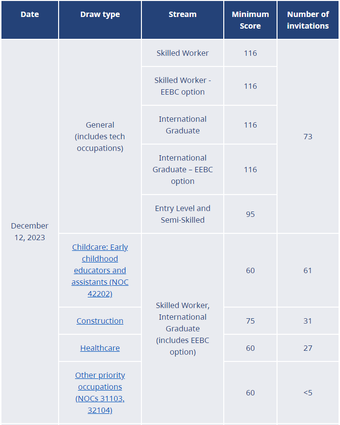 当地时间12月12日,BCPNP进行了一轮抽签,具体邀请情况如下: