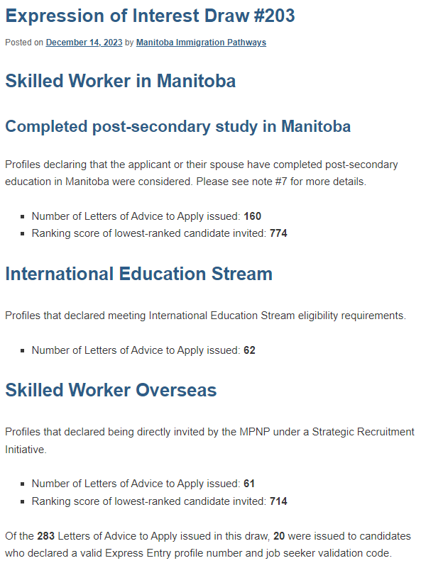 当地时间12月14日,MPNP进行了最新一轮曼省省内技术工人类别、海外技术工人类别和国际留学生类别邀请。具体受邀情况如下: