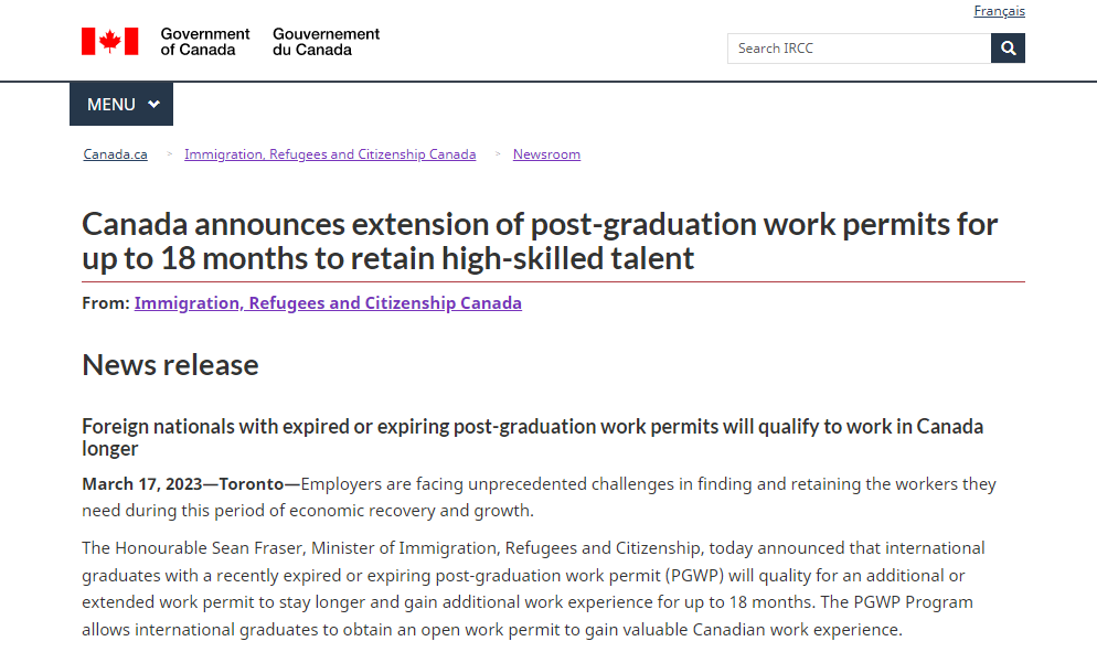 当地时间3月17日,加拿大移民局宣布,凡是毕业工签最近才到期或即将到期的国际毕业生,自2023年4月6日起,将有机会申请延长毕业工签有效期,最长可达18个月。