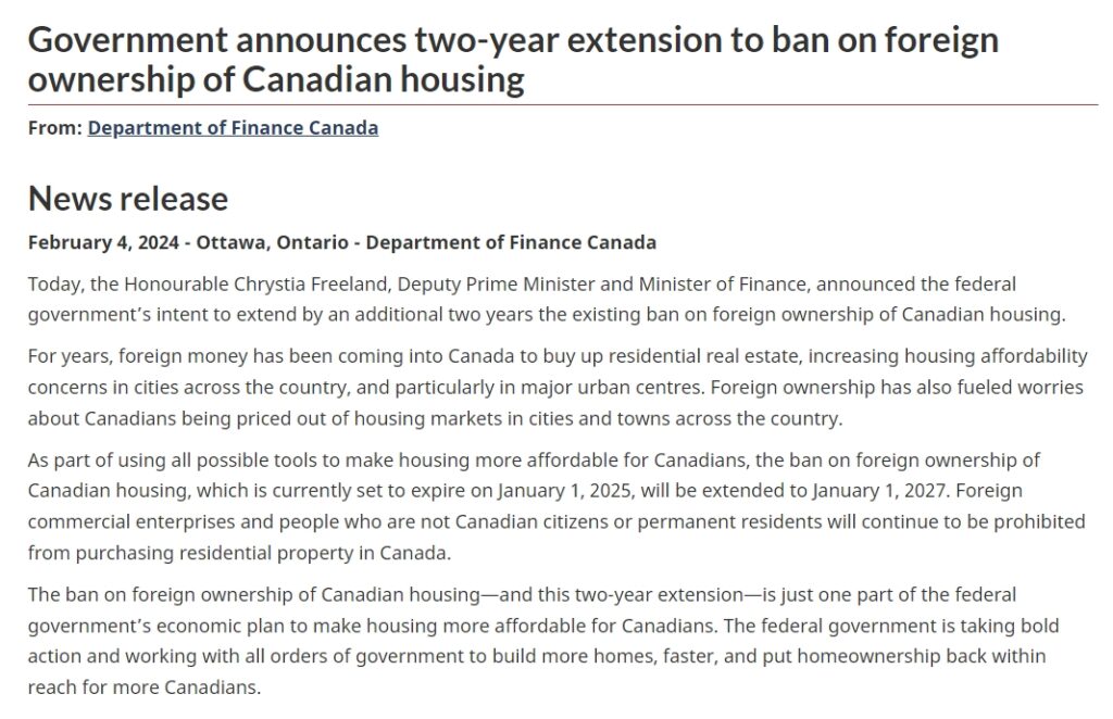 当地时间2月4日,加拿大财政部长宣布,联邦政府将《禁止非加拿大人购买住宅物业法案》延长至2027年。该法案于2022年6月23日由议会通过,于2023年1月1日生效,原本的有效期至2025年1月1日,目前延长至2027年1月1日