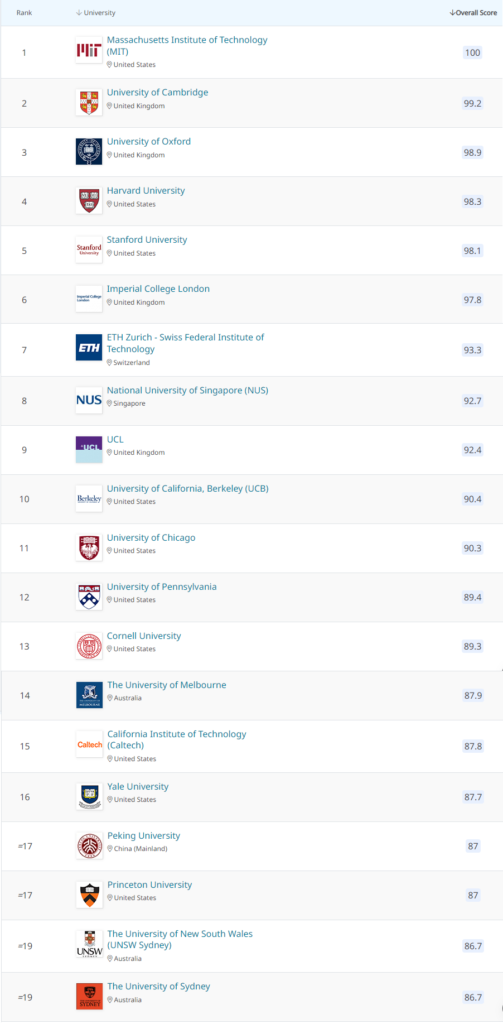 其结果借鉴了对1750万篇学术论文的分析以及超过24万名学术界人士和雇主的专家意见。麻省理工学院连续12年保持榜首地位,剑桥大学保持第二名,而牛津大学(第三名)则攀升了一个排名位置。