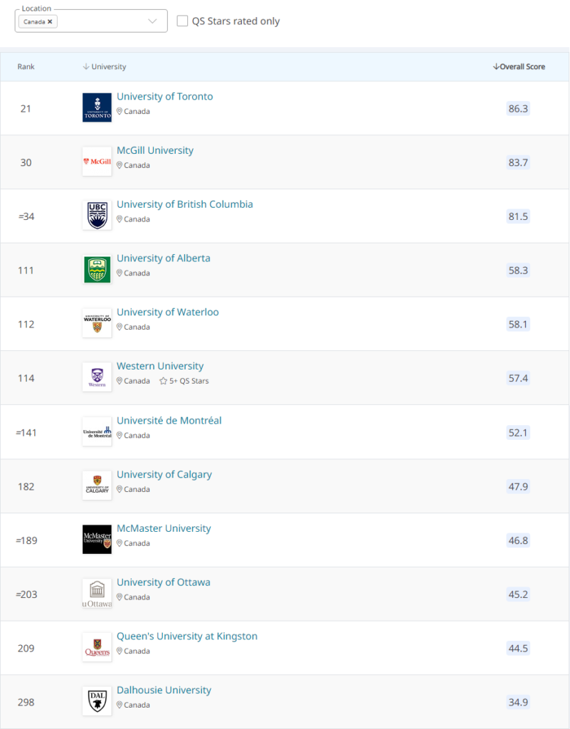 加拿大有12所高校进入了2024年QS世界大学排名前300,其中3所高校跻身前50,2所高校进入前30,排名情况如下: