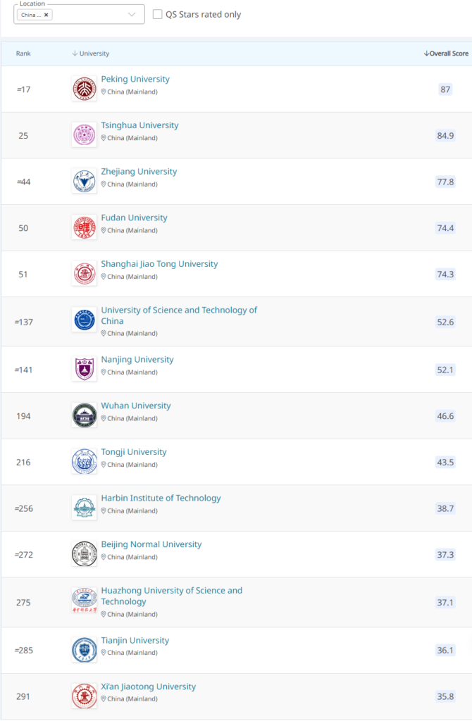 中国有14所高校进入了2024年QS世界大学排名前300,其中4所高校跻身前50,2所高校进入前30,排名情况如下: