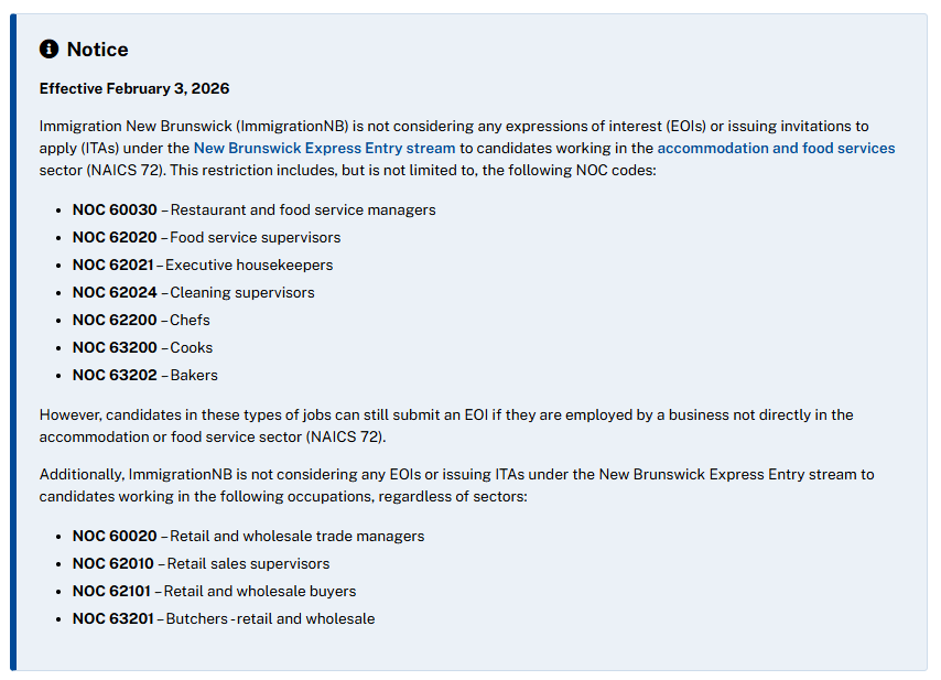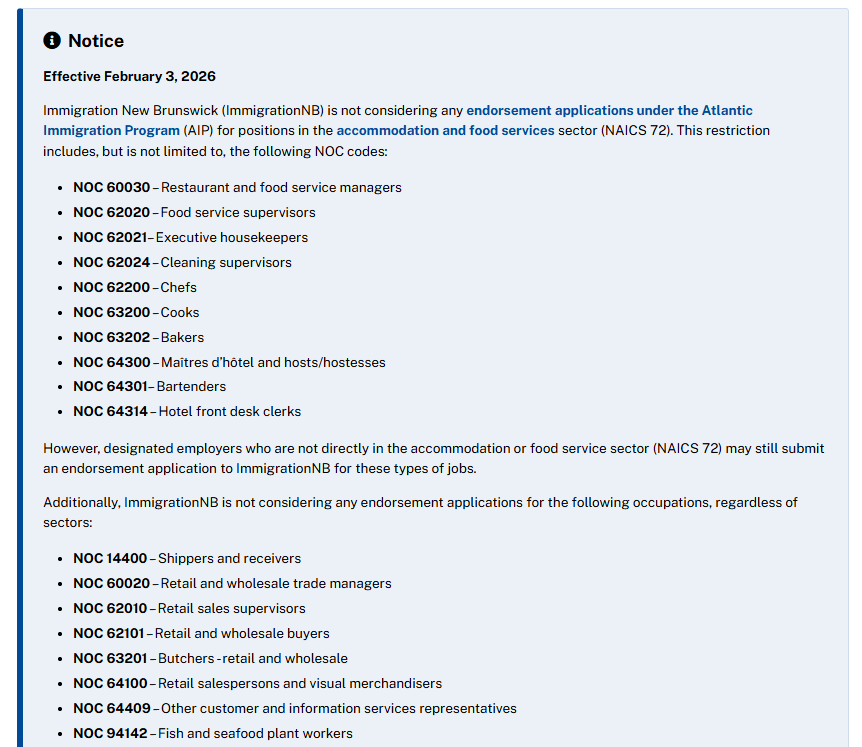 自2026年2月起,纽省已明确停止接受AIP Endorsement 或 NBPNP EOI 邀请中涉及住宿和餐饮服务类职位(NAICS 72)的申请。这包括但不限于以下职位类别(NOC):