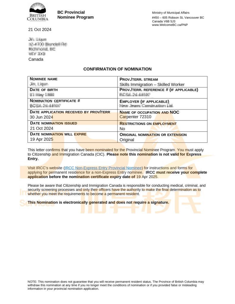 BCPNP Nomination Letter