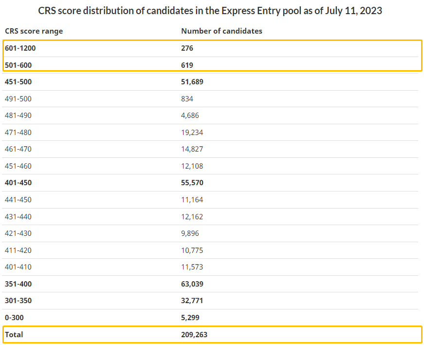 500分以上的候选人多为获得600分加分的PNP候选人或获得工作机会加分的其他候选人。