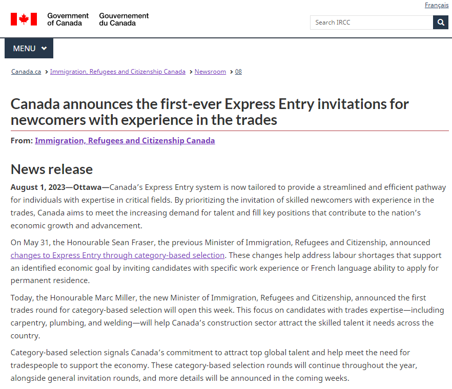 另外,移民局还在宣布将在本周进行首轮技工职业类别邀请。