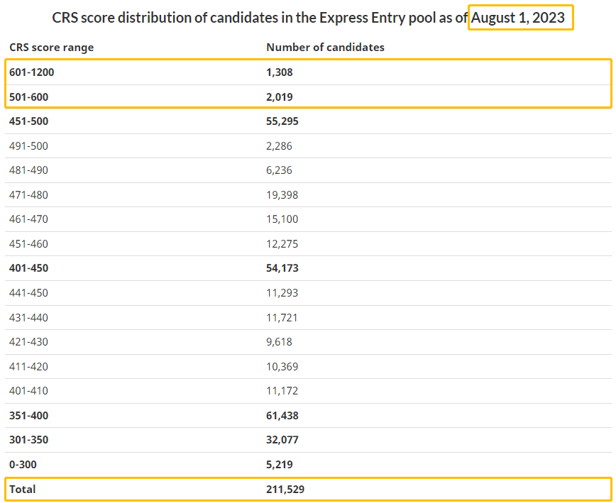 截止到8月1日,EE候选池中有约21.2万份申请未被邀请,其中451-500分的候选人有约5.5万人,500分以上的候选人有3327人。