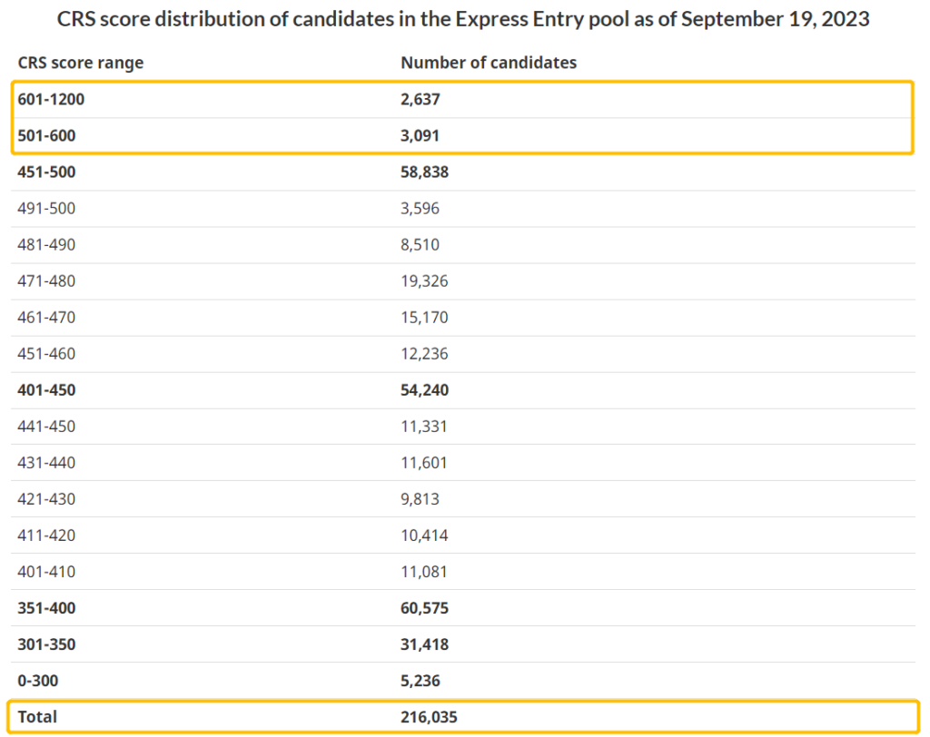 截止到9月19日,EE候选池中有约21.6万份申请未被邀请,其中451-500分的候选人有约5.9万人,500分以上的候选人有5728人。