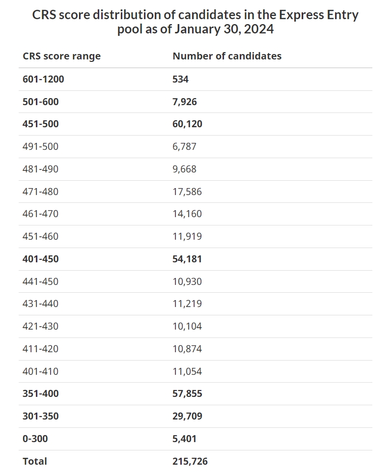 截止到1月30日,EE候选池中有近21.6万份申请未被邀请,其中451-500分的候选人有约6万人,分数达到500分以上的候选人有8460人。