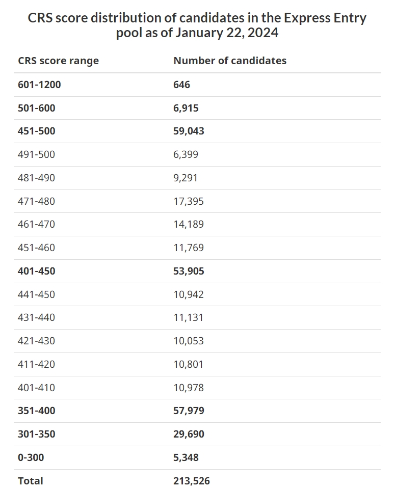 截止到1月22日,EE候选池中有近21.4万份申请未被邀请,其中451-500分的候选人有约5.9万人,分数达到500分以上的候选人有7561人